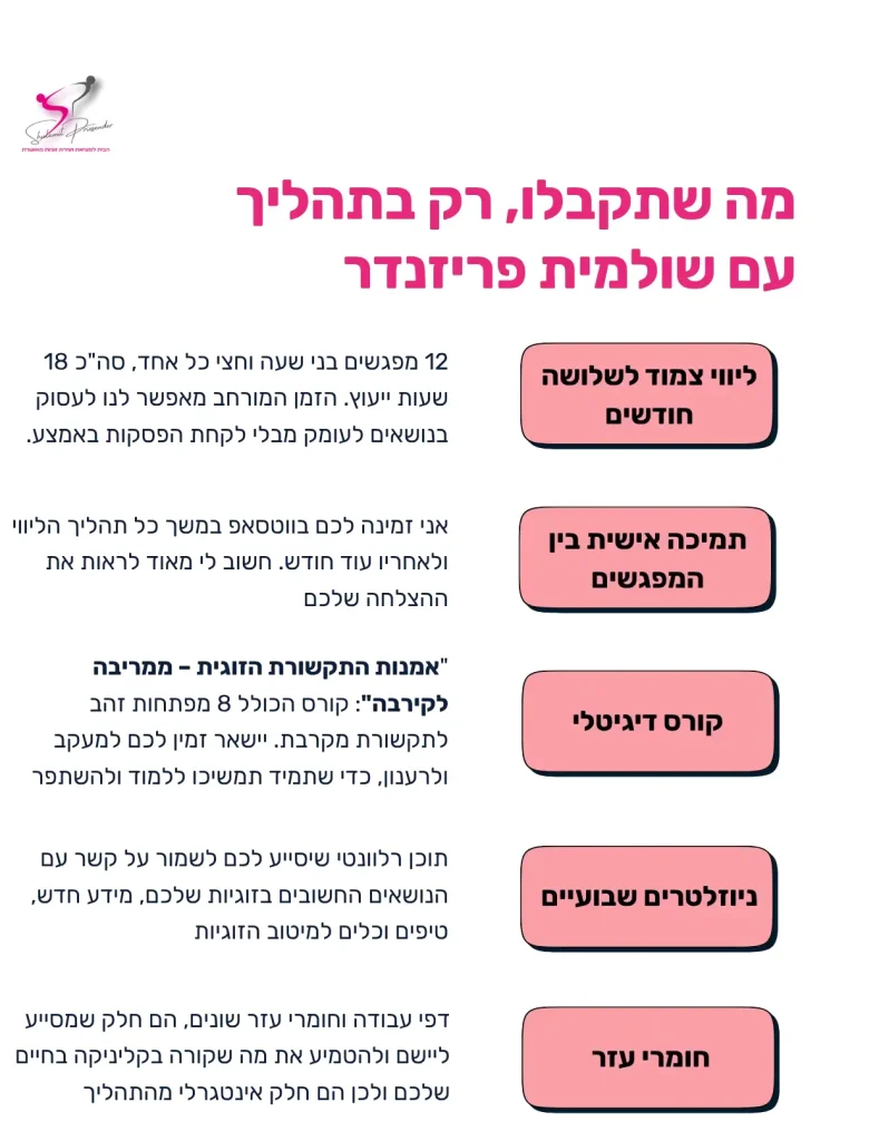לא משנה באיזה שלב במסע הזוגי אתם נמצאים – בתחילת הקשר, לפני מיסודו, לפני הורות ראשונה או בזוגיות "וותיקה" – במשבר או עם רצון לשפר – אפשר לבנות וליצור זוגיות משגשגת לשנים ארוכות.