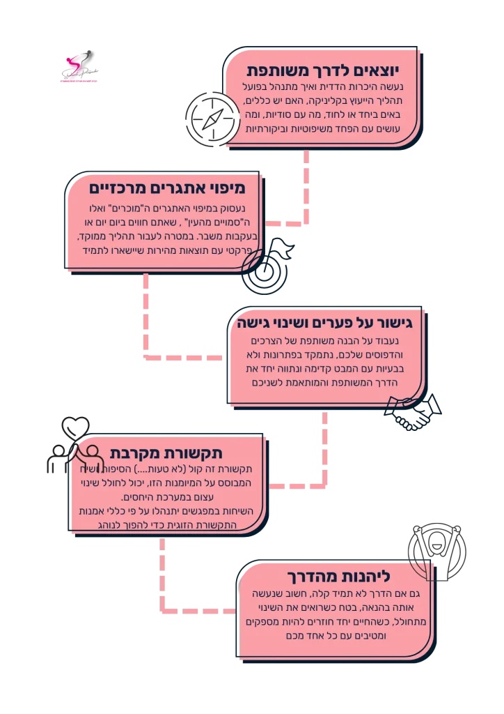 וזה בדיוק מה שאנחנו עושים בייעוץ הזוגי – אנחנו מפתחים את עבודת הצוות, לומדים לעבוד יחד כדי למצוא פתרונות שמתאימים לשניכם ולקבל כלים כדי למצוא כאלה גם בעתיד.